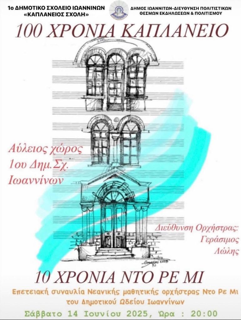 Σας προσκαλούμε το Σάββατο 14 Ιουνίου 2025, στην επετειακή συναυλία μαθητικής ορχήστρας Ντο Ρε Μι του Δημοτικού Ωδείου Ιωαννίνων στις 8μ.μ. στον αύλειο χώρο του Σχολείου μας.